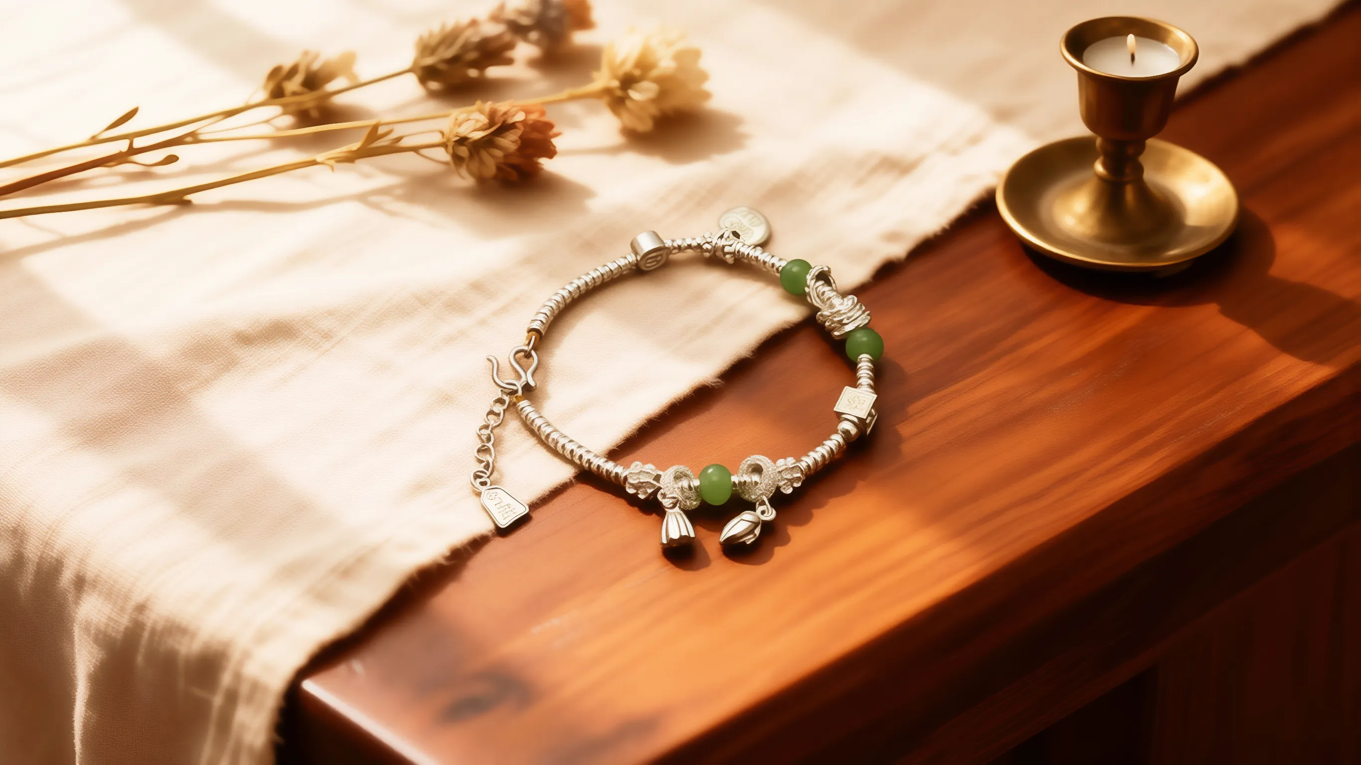 999.9 Pure Silver Bracelet with Green Beads & Lucky Charms, Elegant Handmade Jewelry for Women
